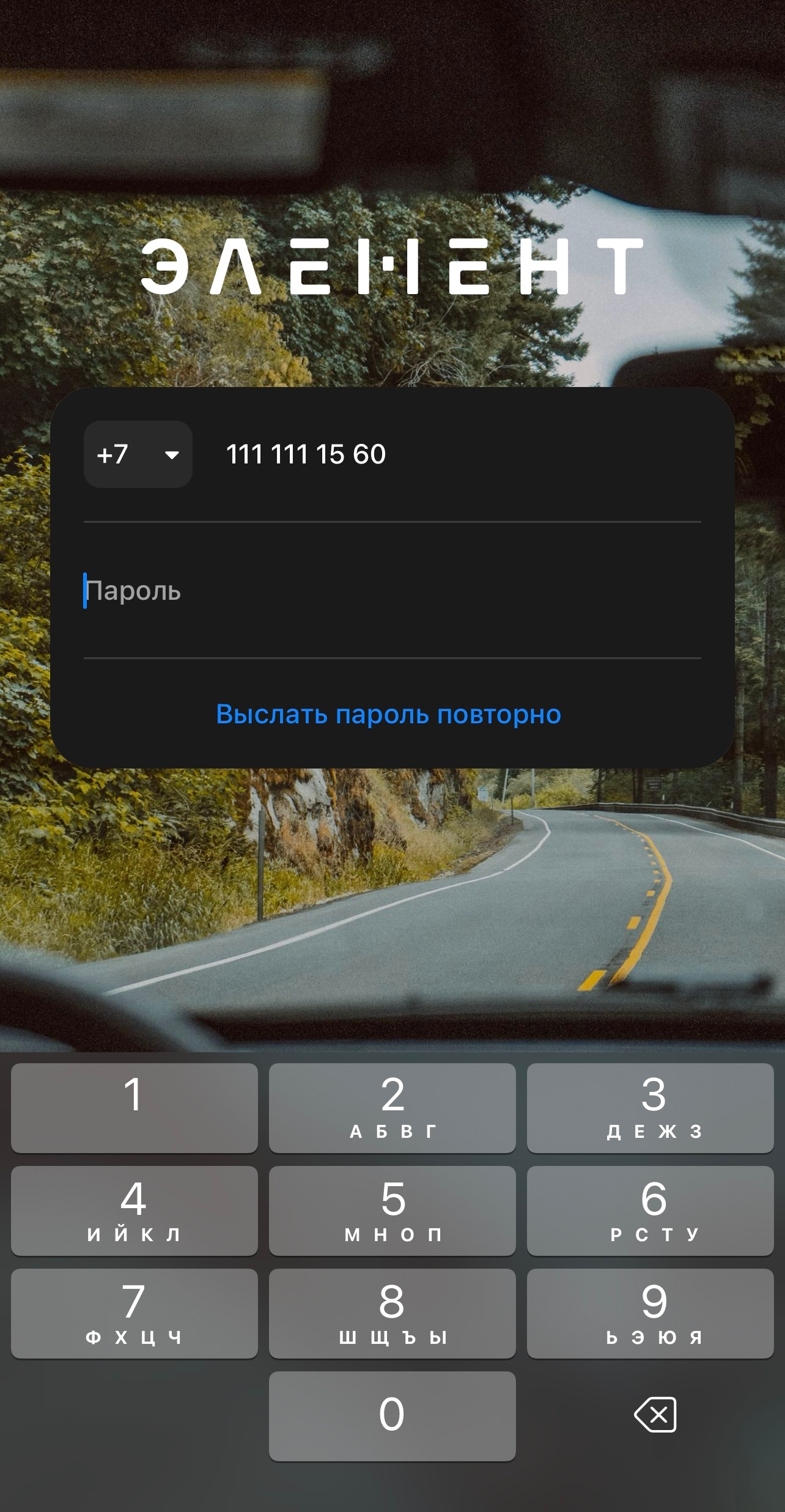 Для входа в мобильное приложение Элемент введите телефон и код авторизации.