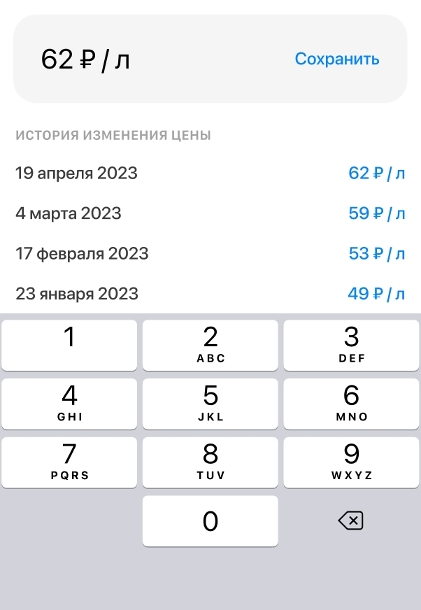 При нажатии на график на экране статистики открывается история стоимости топлива с возможностью ввести стоимость в рублях/ литр.