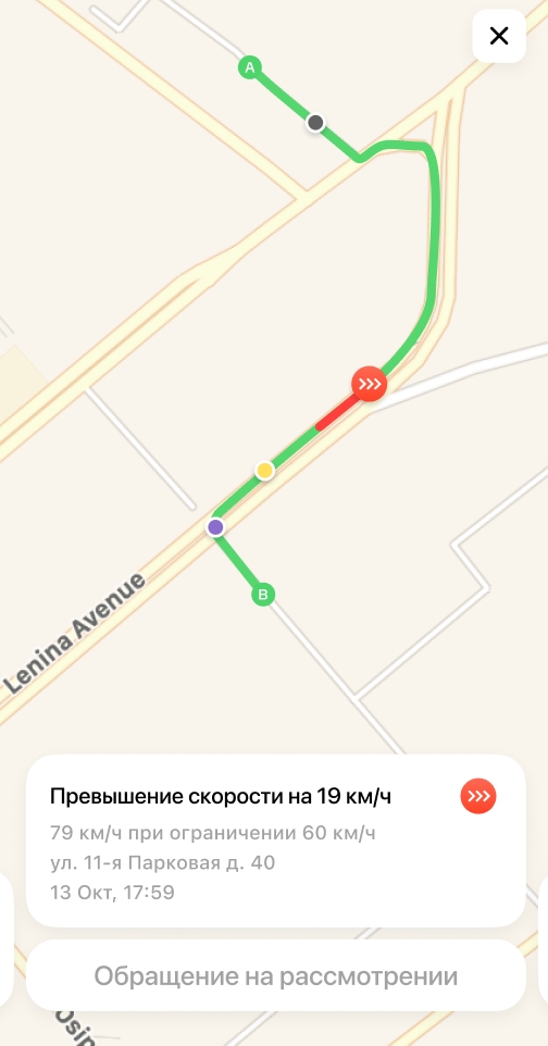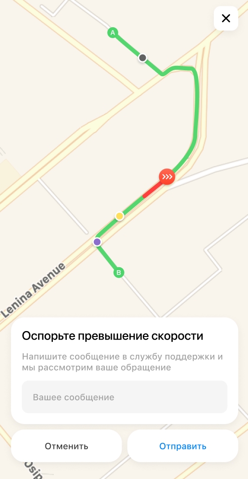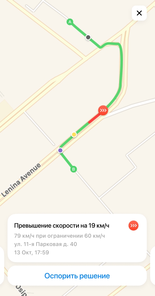 При наличии событий-нарушений в поездках все они отображаются в информации по поездке и на треке поездки. Приложение позволяет оспорить превышение скорости, если вы не согласны с данным событием. Выберите требуемое превышение скорости и нажмите "Оспорить решение".