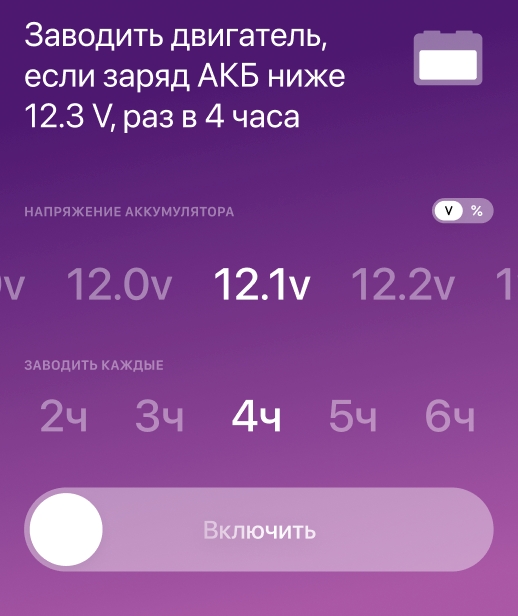Данная настройка позволяет задать сценарий запуска двигателя при определенном заряде аккумулятора автомобиля.
