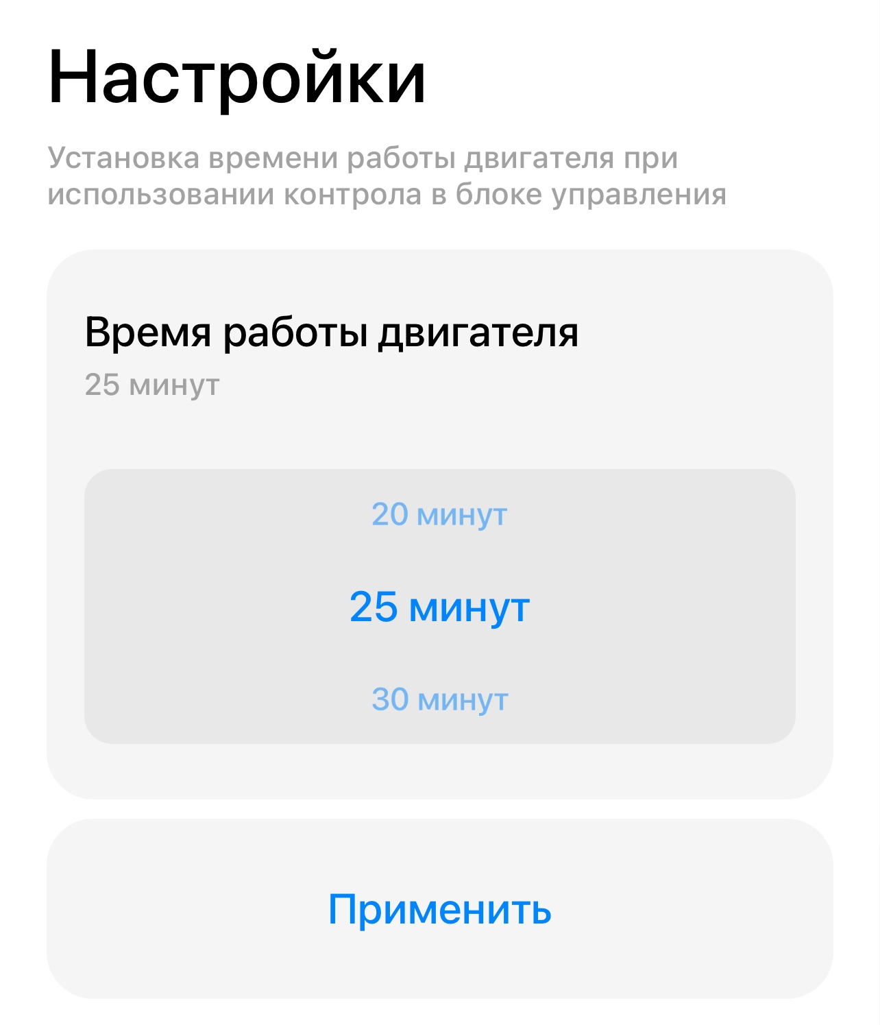 Длительность работы двигателя настраивается кратно 5 минутам, для подтверждения выбранного времени нажмите кнопку "Применить".